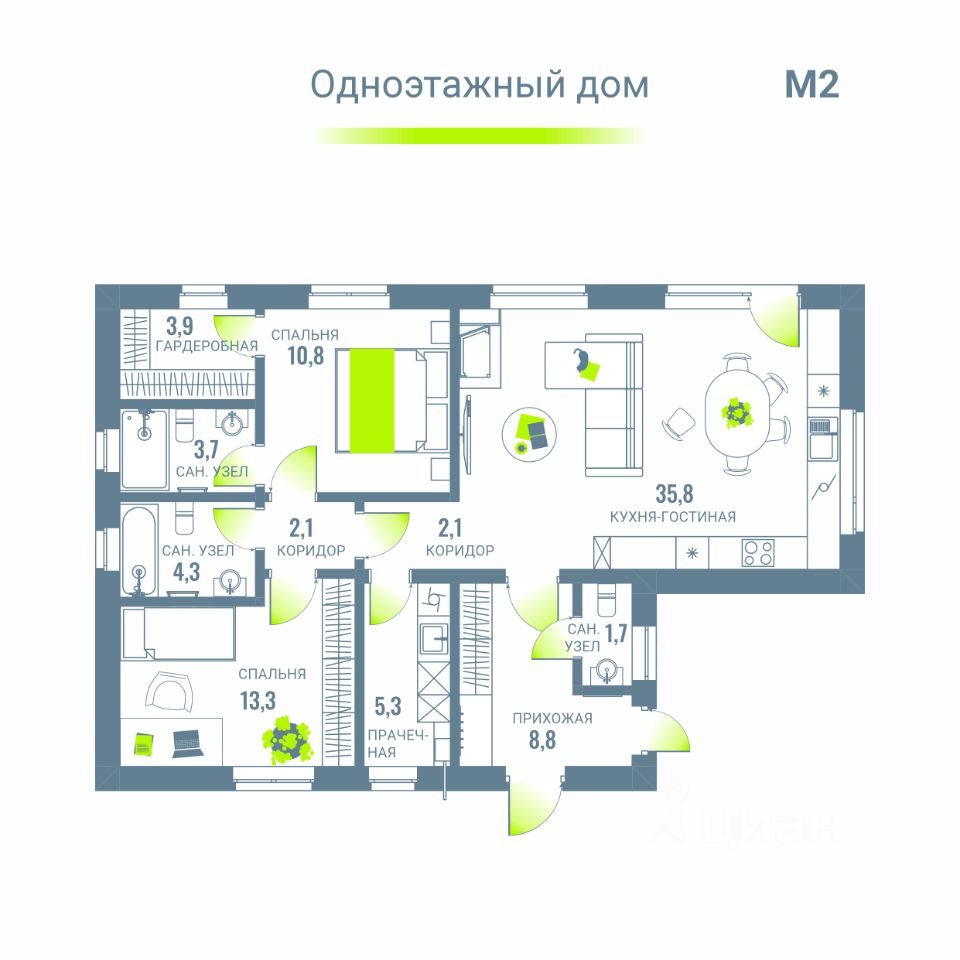 О ПЛАНИРОВКЕ Общая площадь - 91,78 м2. Гостиная с кухней Cанузел Коридор и прихожая Две спальни Прачечная