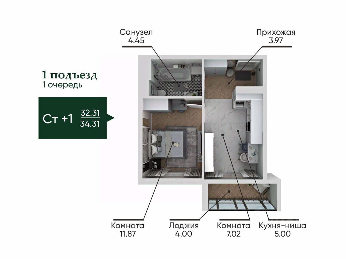 ЖК ''Ильменский'' открывает продажи! квартира 23, общей площадью 34.31 на 5 этаже.