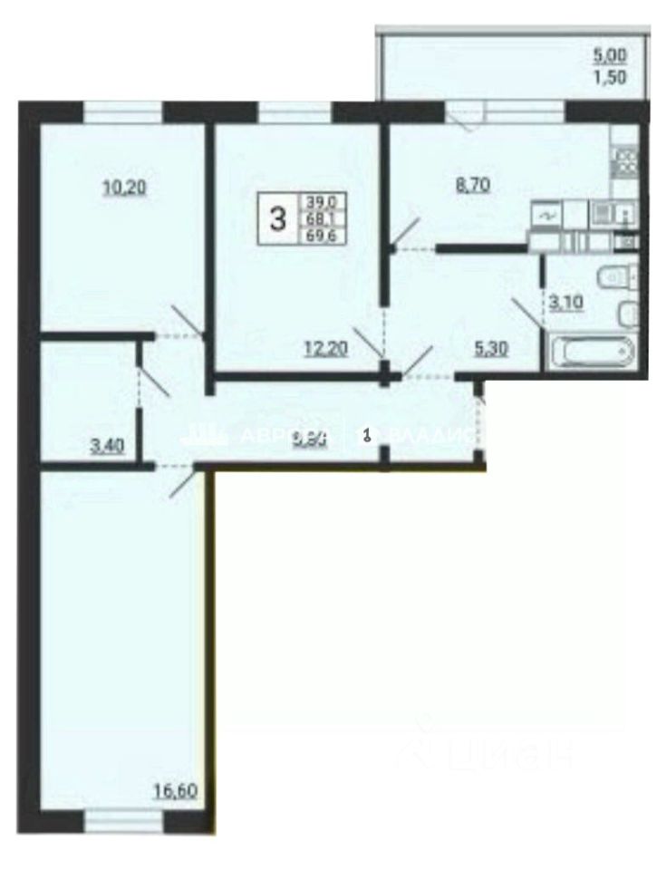 Площадь и планировка: общая площадь квартиры составляет 69,8 кв. м, из которых 39 кв. м — жилая площадь. Три изолированные комнаты (12,2 + 16,6 + 10,2 кв. м) и кухня площадью 8,7 кв. м. Высота потолков — 2,8 м, что создаёт ощущение простора.